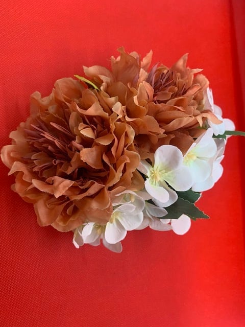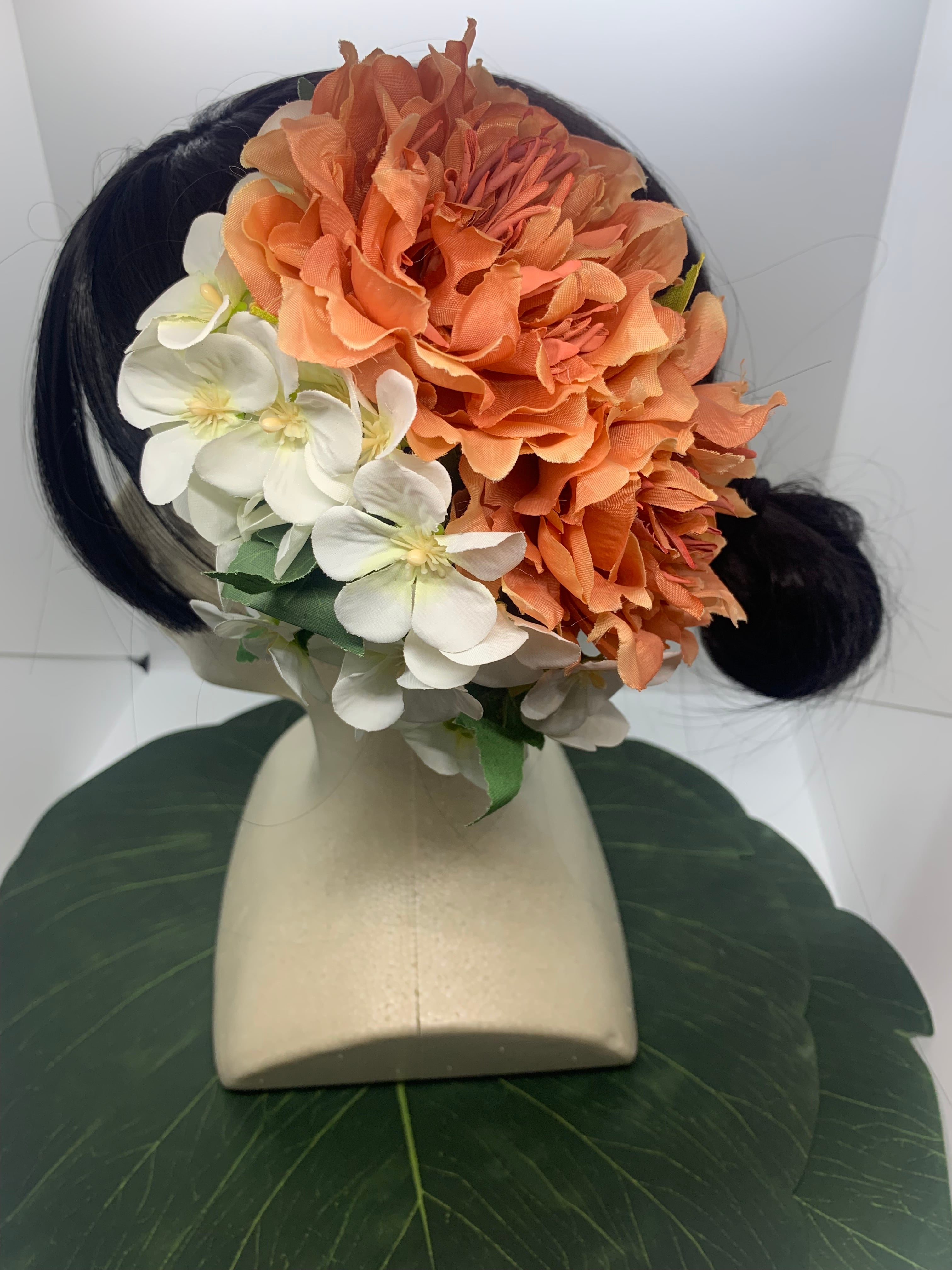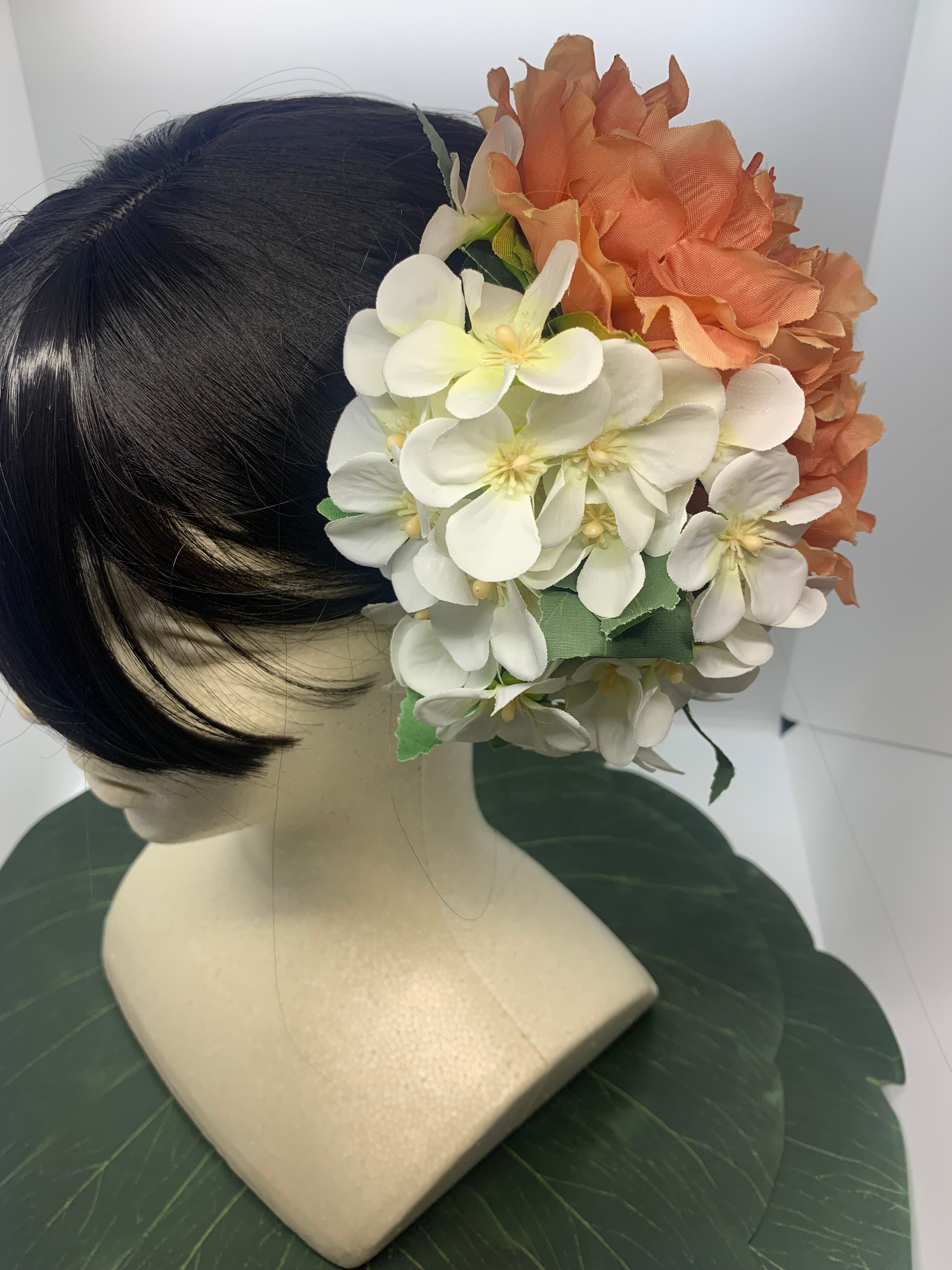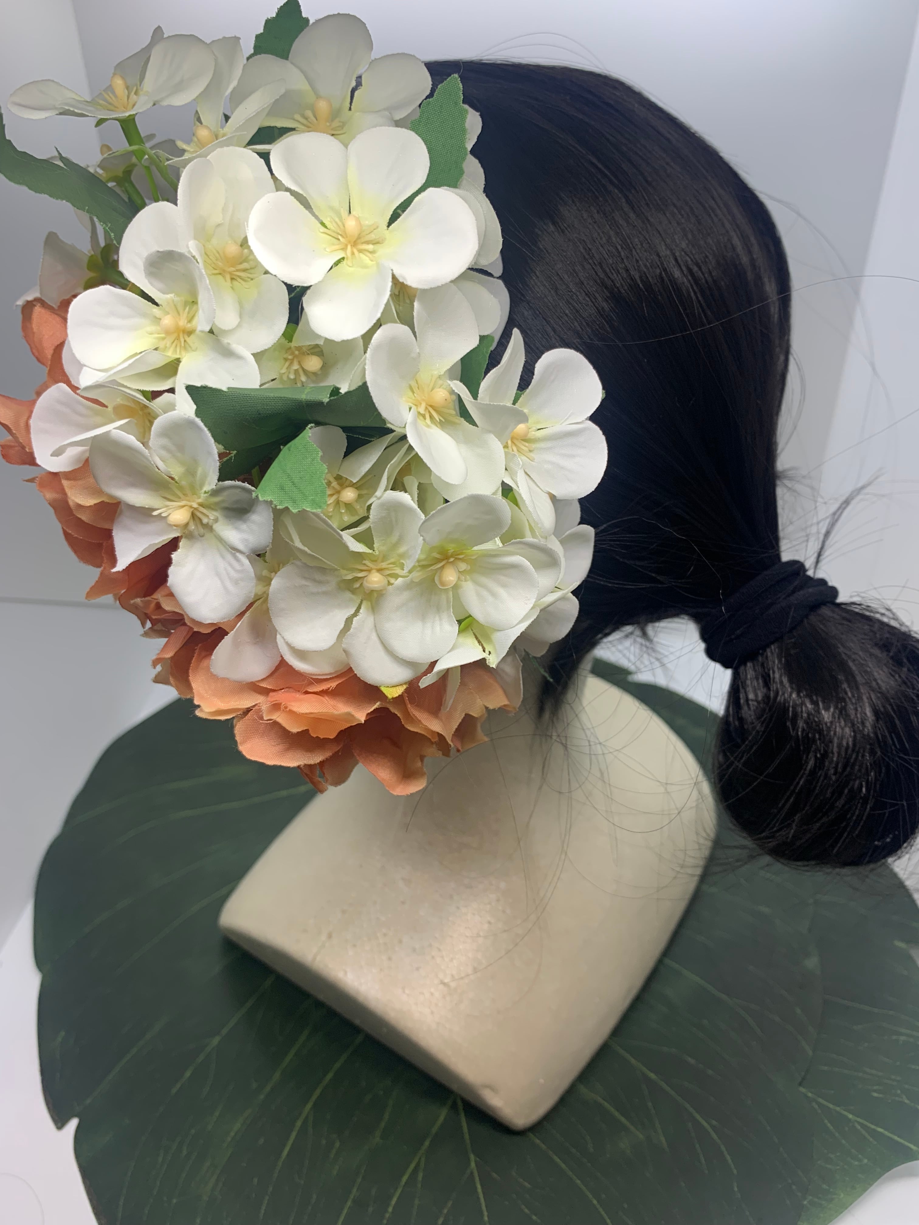 妖精から生まれたと言われてるピオニーの髪飾り、柔らかな印象のベゴニアと組合せて可憐な雰囲気にしました。